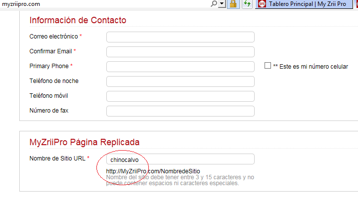 www.myzriipro / tablero principal /perfil / editar dominio web / URL del sitio web